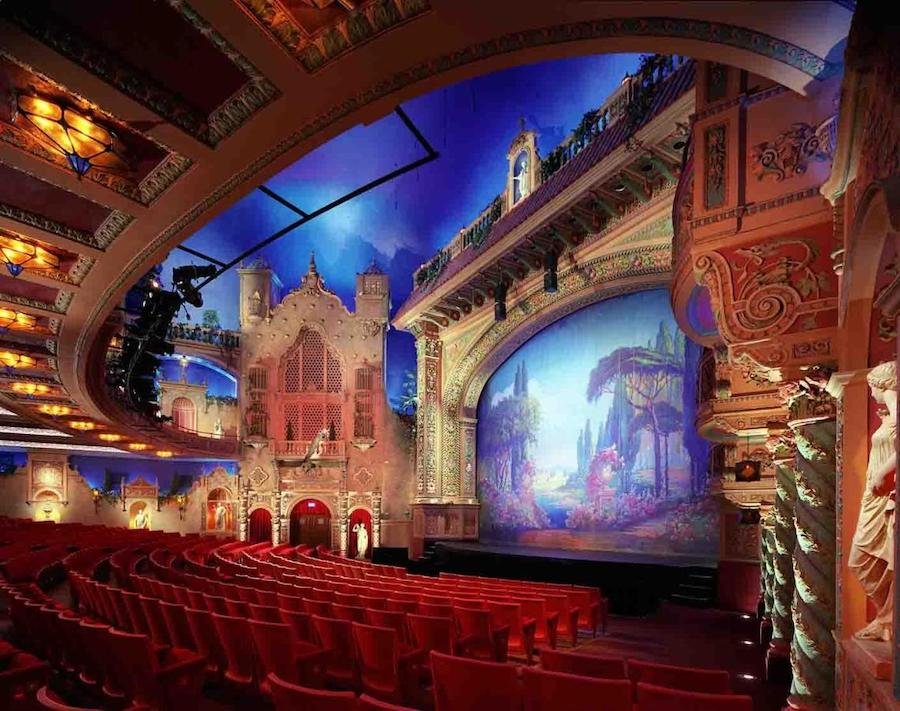Interior del Olympia Theater, con su escenario principal y decoraciones originales de estilo mediterráneo. Foto Olympya Theater