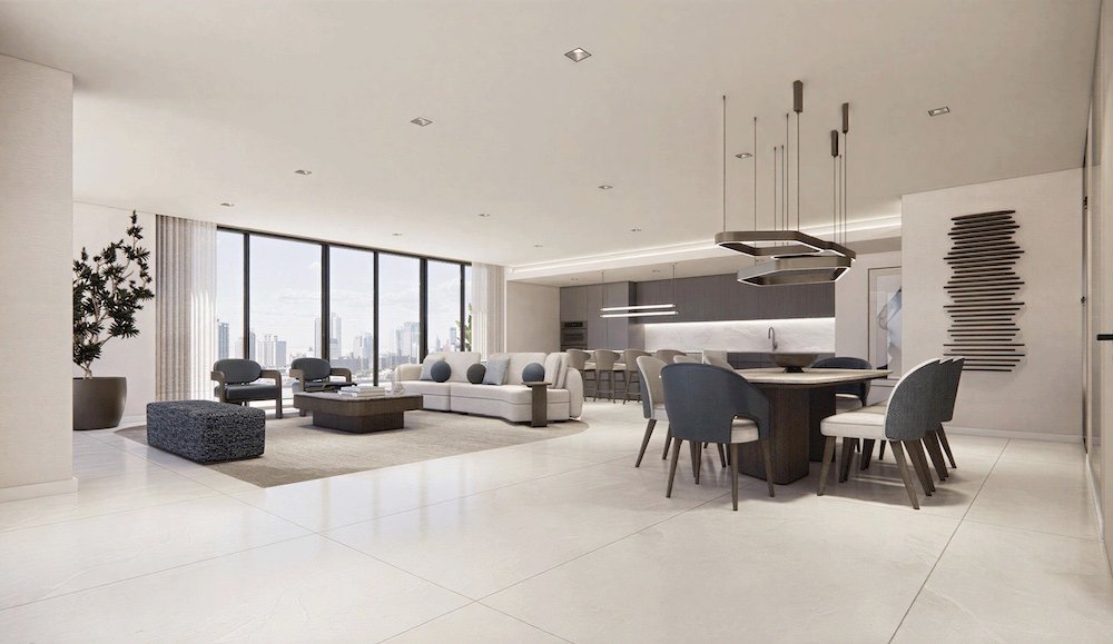 Ubicadas en pisos altos, pero no en el nivel superior del edificio, estas residencias de un solo nivel apuestan por la amplitud, la luz natural y el diseño sofisticado sin recurrir al exceso. Con superficies que van desde los 1,700 hasta más de 3,100 pies cuadrados, techos de doble altura y balcones que se abren hacia Biscayne Bay, la colección busca atraer a quienes entienden que el verdadero lujo está en los detalles, no en la altitud.